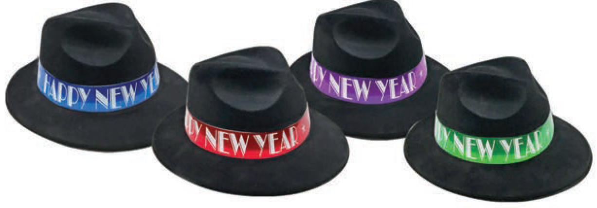 BLACK VELOUR FEDORAS WITH ASSORTED COLOR HAPPY NEW YEAR BANDS