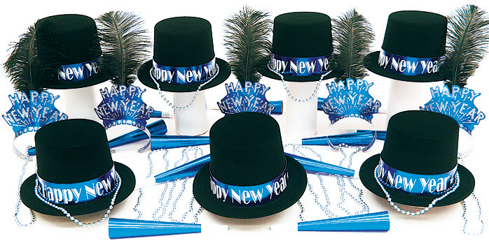 25 Full Size Black Velour Top Hats with Blue Foil Happy New Year Band 25 Happy New Year Plume Tiaras 50 Blue Foil Horns 25 Silver Metallic Beads