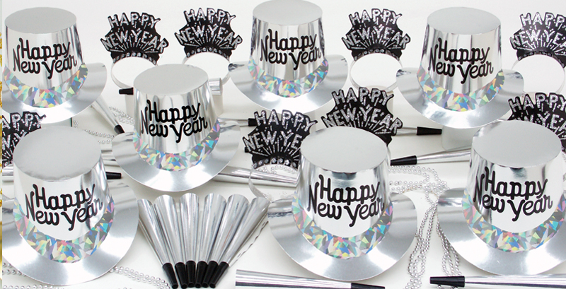 25 Full Size Curved Brim Foil Top Hats with Happy New Year & Prismatic Band 25 Happy New Year Tiaras 50 Foil Horns 25 Silver Metallic Beads