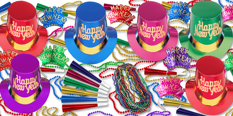 25 Full Size Foil Curved Brim Top Hats 25 Gold Glittered Happy New Year Tiaras 50 Foil Horns 25 Assorted Metallic Beads